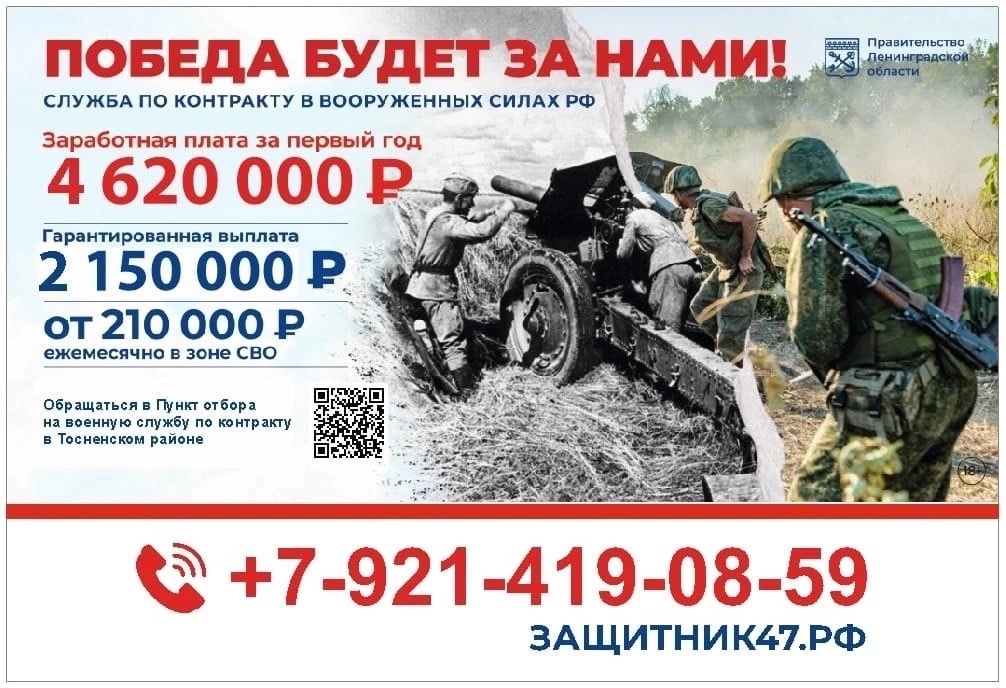 Обращаться в Пункт отбора на военную службу по контракту в Тосненском районе по телефону +79214190859