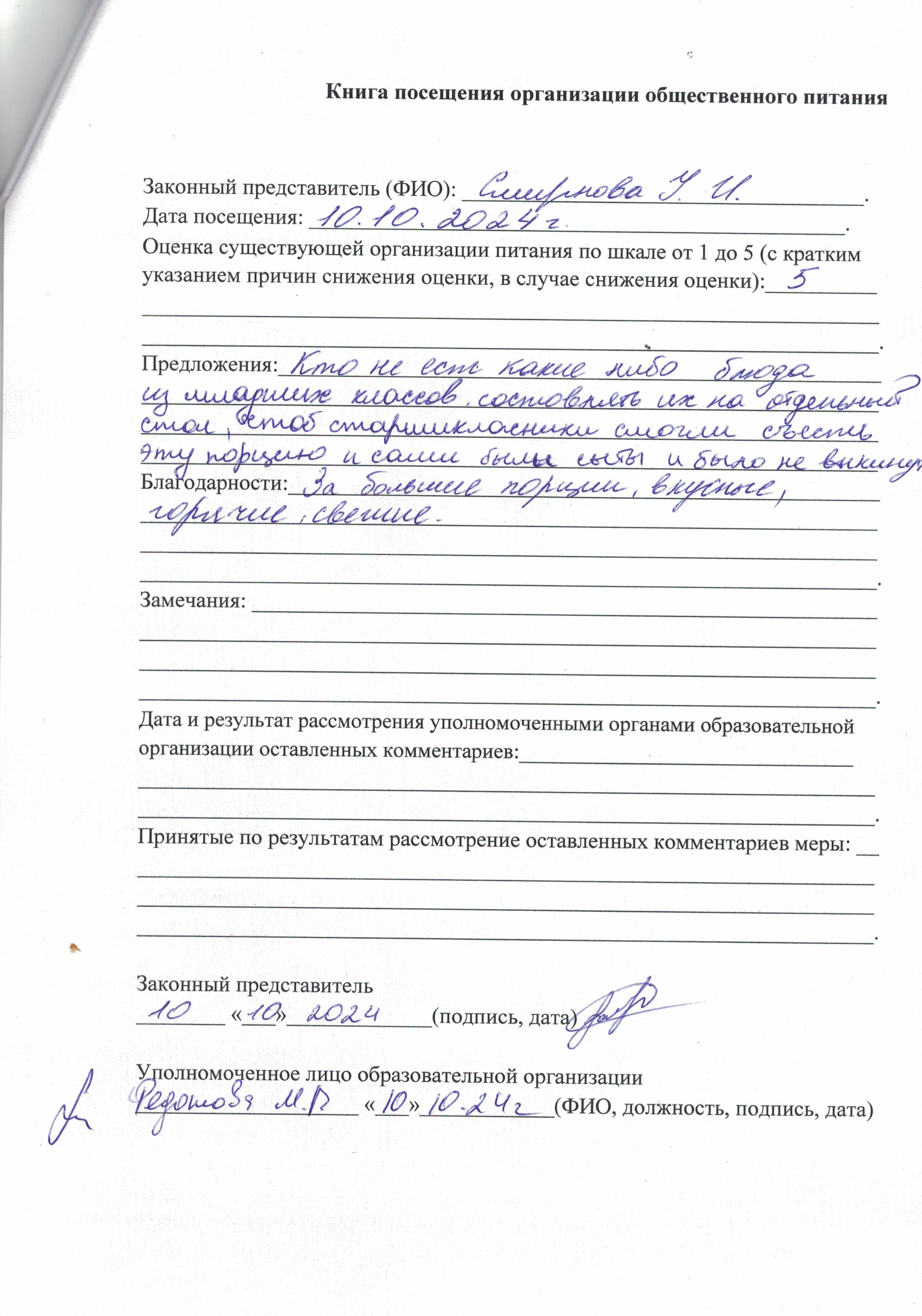 10 октября 2024 года в школе был осуществлён родительский контроль организации горячего питания обучающихся. Смирнова У.И., мама учащихся 4,7 класса проверила соответствие приготовленных блюд утверждённому меню, сняла пробу приготовленных блюд. Замечаний к организации питания детей нет.