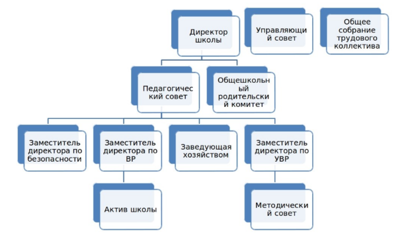 К управлению школой привлекаются все участники образовательного процесса: педагоги (Управляющий совет, Педагогический совет), родители (родительский комитет, Управляющий совет), ученики (Управляющий совет, ученический совет).