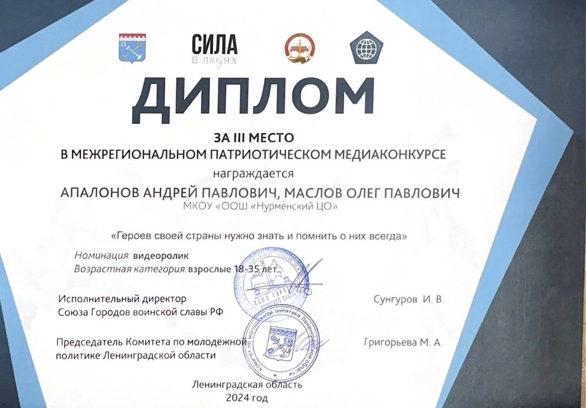 В 2024 году мы приняли участие в Межрегиональном патриотическом медиаконкурсе, в котором заняли 3 место в номинации «Видеоролик» по теме: «Твой герой», в котором обучающиеся рассказали про Виктора Антоновича Вержбицкого и значимости его фигуры в нашей школе. Награждение прошло в Правительстве Ленинградской области 29 ноября 2024 года.